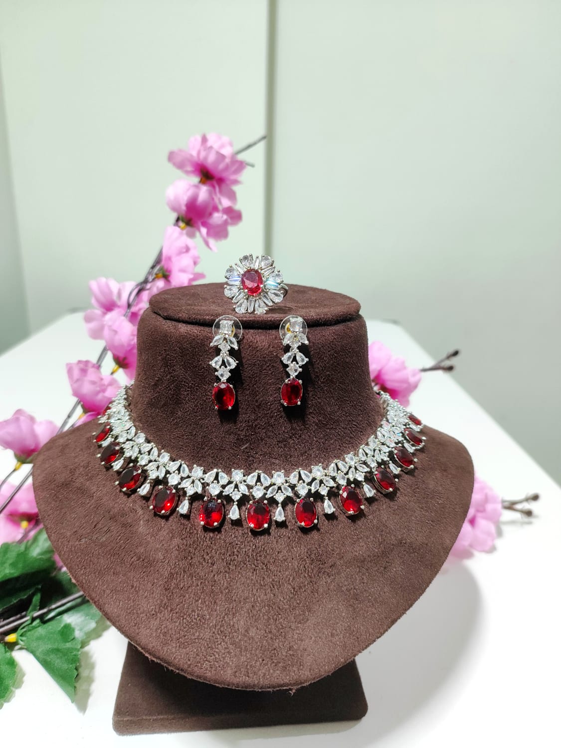 Red American diamond necklace set with a ring